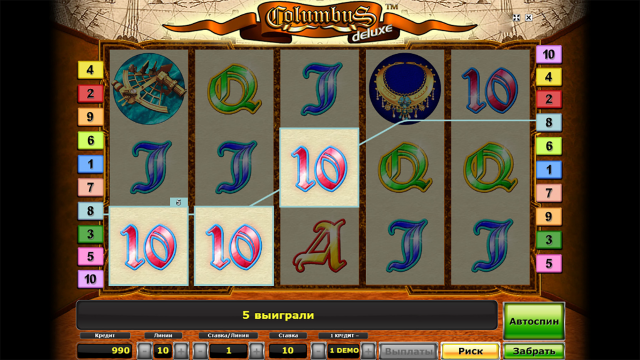 Максимальный множитель слота — x5000 на ставку одной активной линии. Рекордная выплата присуждается при выпадении призовой комбинации из 5 символов с изображением главного персонажа (Колумб). Эта же картинка выполняет роль Вайлда.