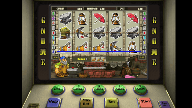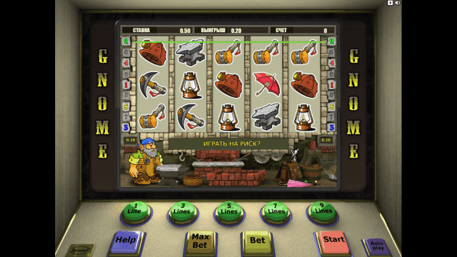 В видеослоте Gnome имеется 5 барабанов и 9 линий. Действует многоуровневая система ставок. Количество активных линий можно изменять. Стоимость одного кредита равняется одному рублю. Минимальная ставка на каждую линию — 1 руб., максимальная — 90 единиц игровой валюты.