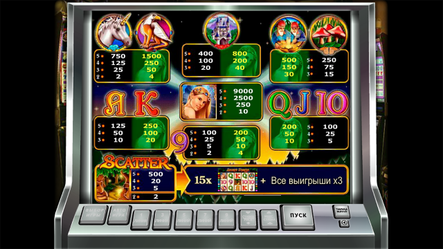 - Номиналы игральных карт, фантастические существа, замок. Цепочки, формируемые ими, оплачиваются по коэффициентам х4-х1500.